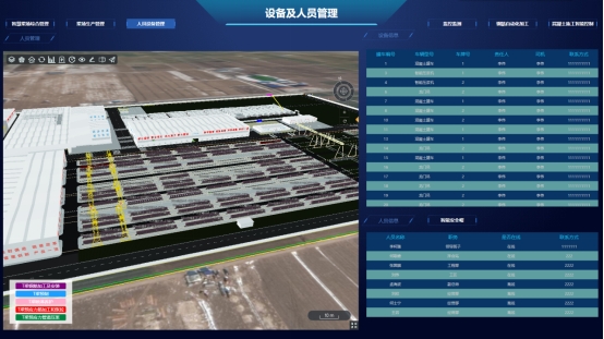 在三维展示页面中,可以通过台座分类编号等相关信息建立台座和梁片的关联信息,通过移动端可以将梁体进行施工中对应的台座进行绑定,在三维页面可以实时查看每一个台座关联的是哪一片梁,为后期管理人员的决策提供相应数据,表格内将展示人员活动情况及设备运行情况。